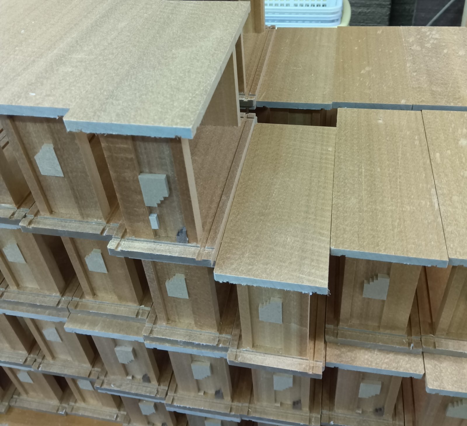The box's frame and some of the intricate internal parts have already been crafted. Since I didn’t have a stock of the small "step" pieces, I had to make them from scratch. These parts are where the internal "bocchi" collide, so I used a slightly harder type of wood. However, using extremely hard woods like Karin, Rosewood, or Purpleheart can cause delicate sections to chip. That's why I typically use Walnut, which is firm but still has some flexibility (photo).
