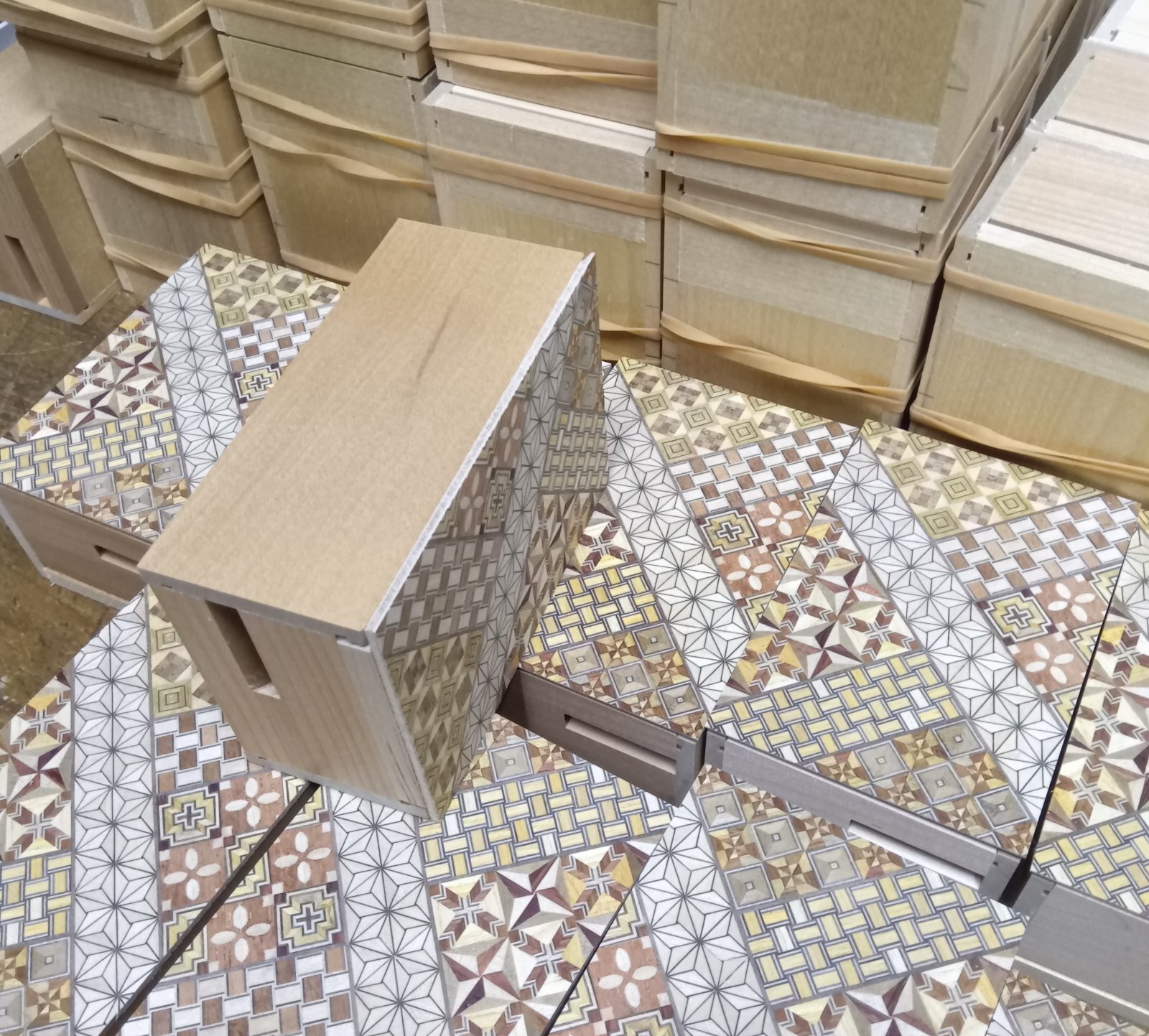 I ran out of time today and was only able to attach the top yosegi panel out of the two for the top and bottom. I will finish the other side tomorrow. Since the yosegi sheet is attached to plywood, I don't usually need to leave it overnight (though it wouldn't be a problem if I did). After about 4-5 hours, I can move on to the next process. That means I can attach the top yosegi panel, and then 4-5 hours later, attach the bottom yosegi panel. Because it's plywood, it doesn’t warp easily from moisture. Usually, panels are left overnight to stabilize against warping caused by glue moisture. For the side yosegi panels of next process, I will apply pressure and leave them fixed overnight to ensure stability. I'll probably continue this work tomorrow...