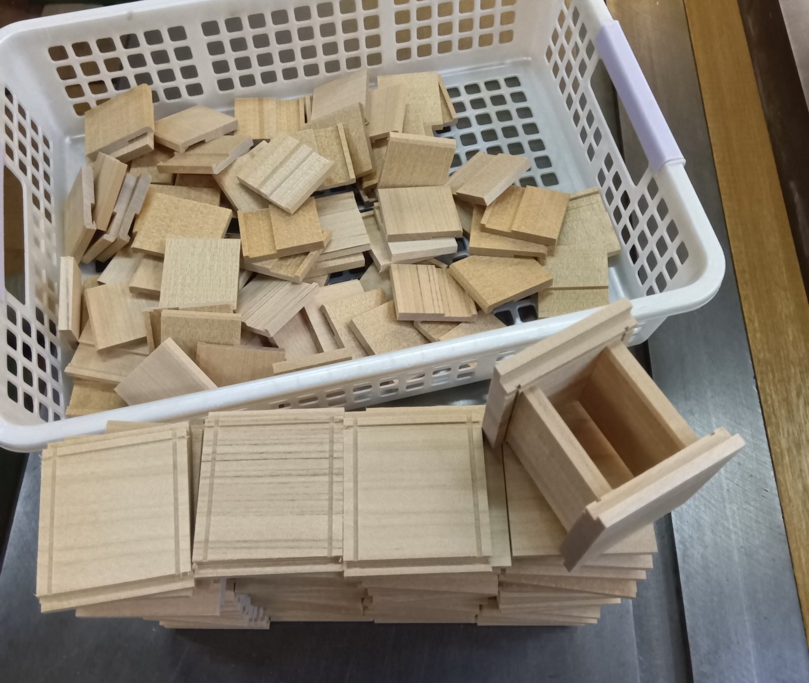 Today, I prepared the materials and made the frame parts. The size is a 2-sun cube, but the thickness of the Aruki panels (moving panels) is the same as the 3-sun 12-steps box—4.5 mm for the top panel and 5 mm for the side panels. The parts for the 2-sun box and the 2-sun cube box are the same, so I will probably need to make more soon because I’ve been using them often lately. The weather should start to improve from tomorrow, but if the humidity is still high, I plan to do the assembly work then.