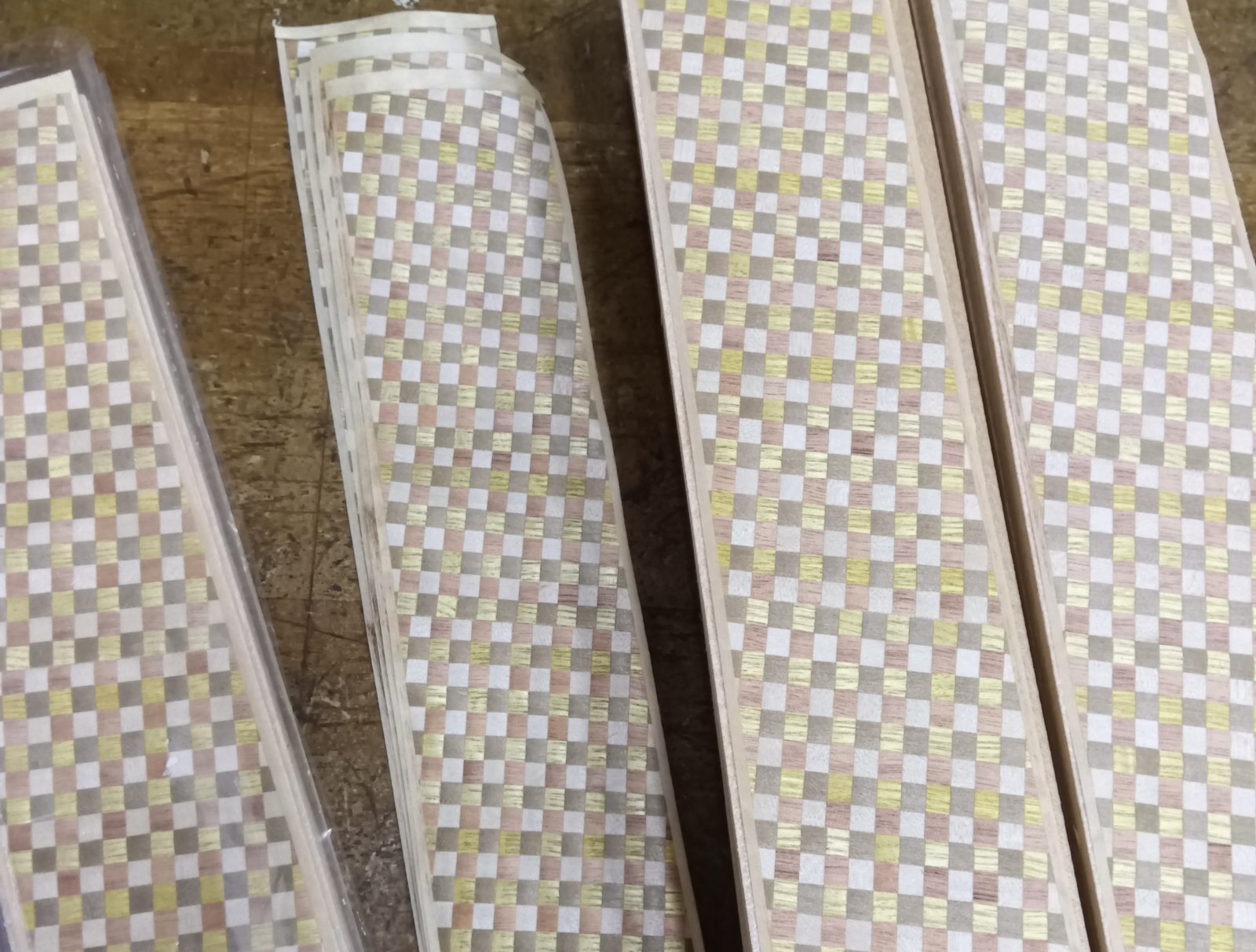 Today, I worked on attaching panels for the 5-sun box, making and installing the Aruki parts for the 4-sun box, and attaching the top and bottom panels. I also began preparations for the next project: a 4.2-sun box. For this, I glued a checkered yosegi sheet onto the boards that will become the side panels. I plan to make about 30 of these boxes.