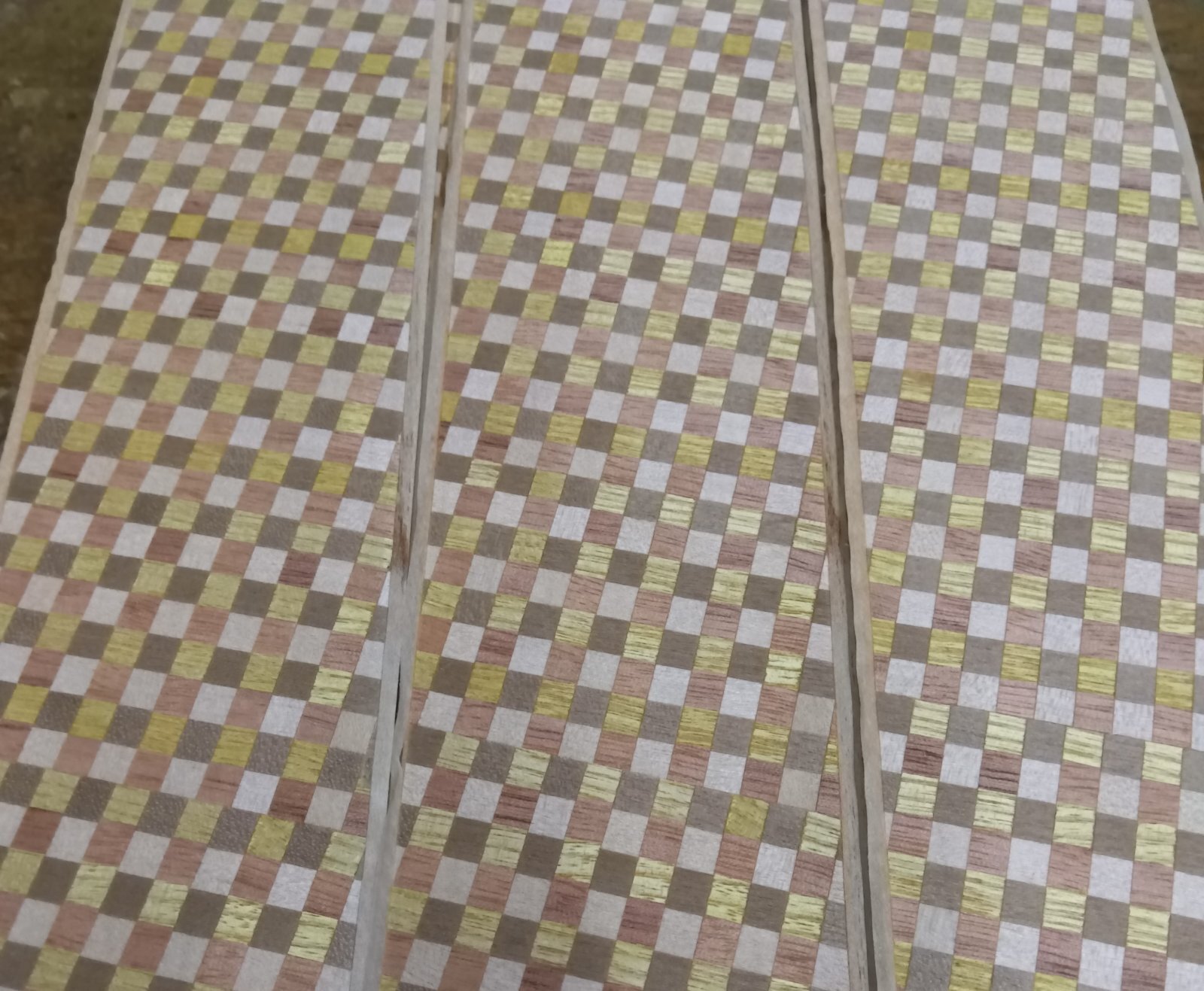I have been making this four-color checkerboard pattern for quite a long time, and for now I have settled on these four colors. In the past, I tried many different woods and colors, but in the end I chose these four kinds of wood because they can be sliced stably. The four are Hoo, Mizuki, Nyatoh, and Urushi wood.