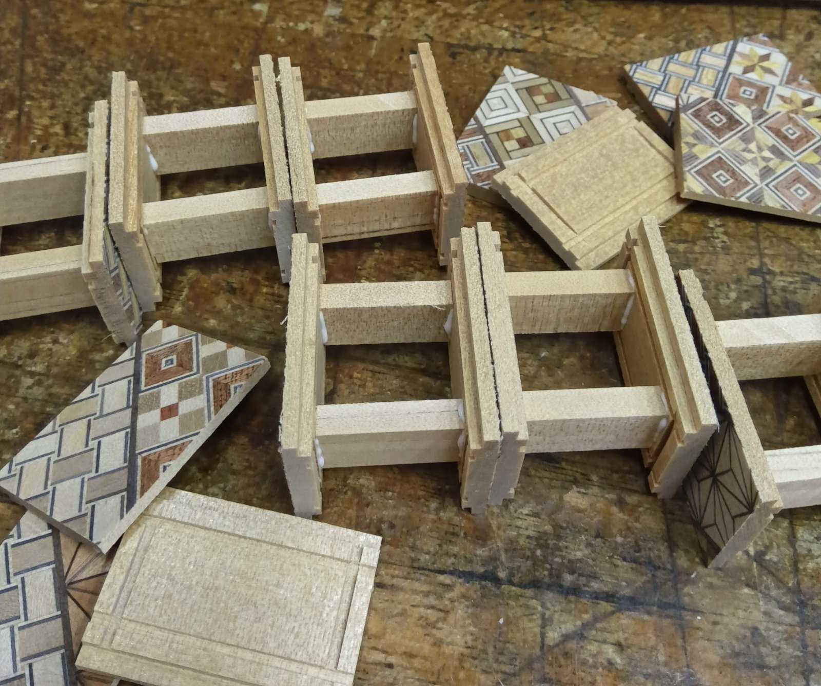 The weather was nice yesterday, so the yosegi panels for the Mame puzzle boxes dried well. They’re now ready for processing. Today, I first made the frame parts and assembled them. I also prepared the materials for the Aruki panels. I think I’ll be able to make about 80 boxes this time. It’s a lot of delicate work, but I’ll keep going patiently.Since these are for Hakone, all of the boxes will be made with traditional yosegi.