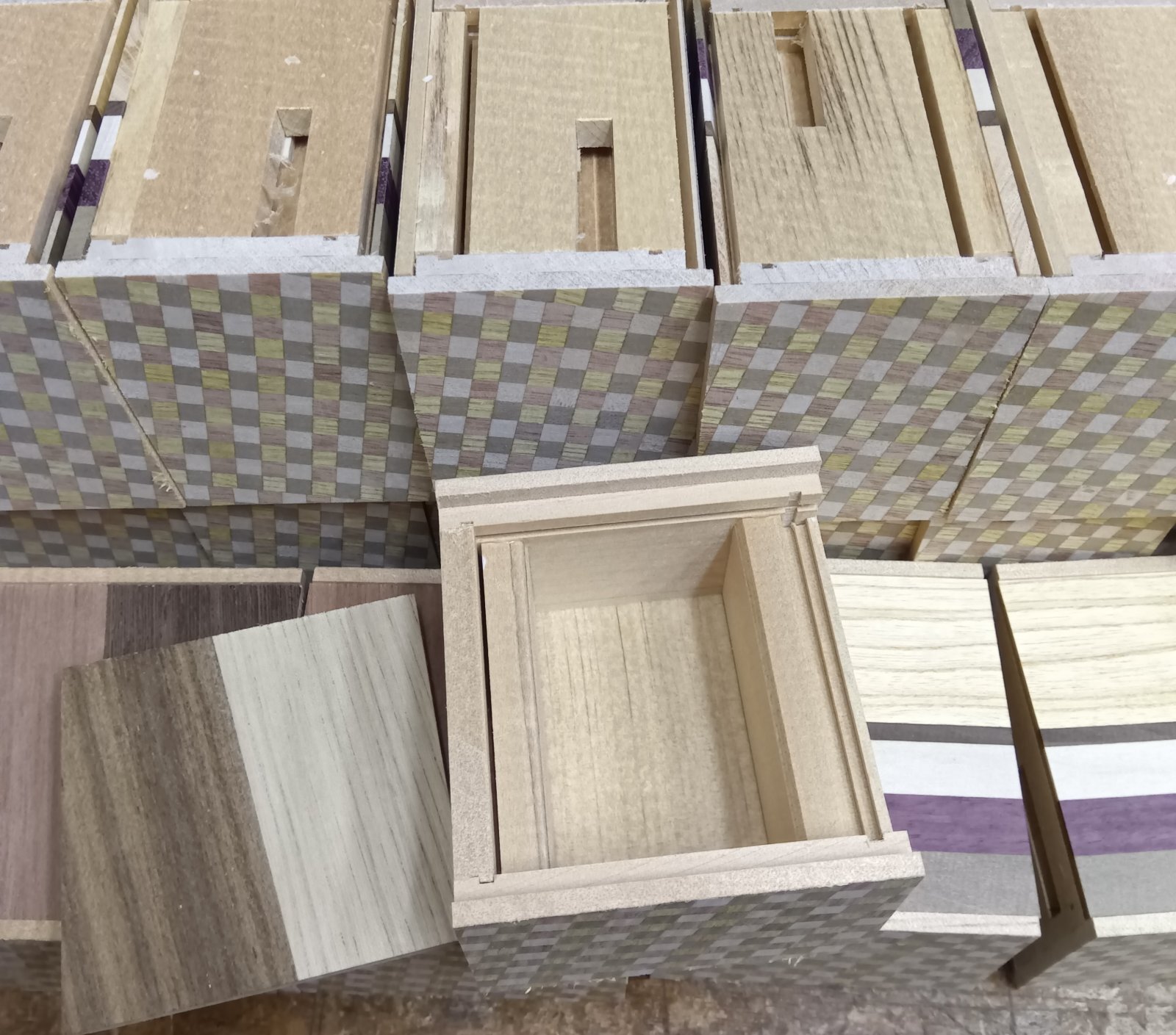 In addition to that, today I made and attached the top and bottom panels for the square 18-steps boxes. I worked on them quickly and plan to return them to the case again this evening. Some of the top and bottom panels for these boxes use the random-grain design that I started making last month. Since that work was finished sooner than I expected, I decided to attach them today.
