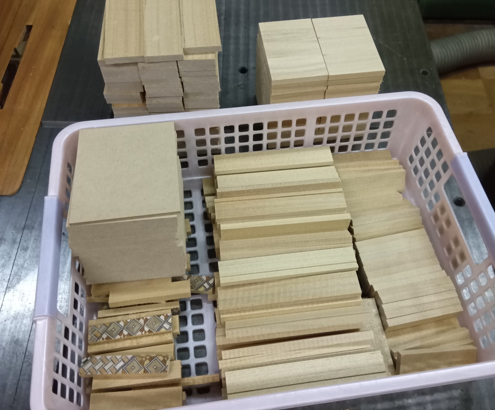 Today, I officially began working on the 5-sun puzzle boxes with drawers. I prepared the materials, trimmed them, and made the frame parts. The frame structure of the drawer-type boxes takes a little more time to build than other boxes, because it includes internal dividers and the shafts on the left and right sides have completely different shapes. It’s not particularly difficult, but there are simply more steps involved. I didn’t get to the assembly stage today, but all the parts were successfully completed.