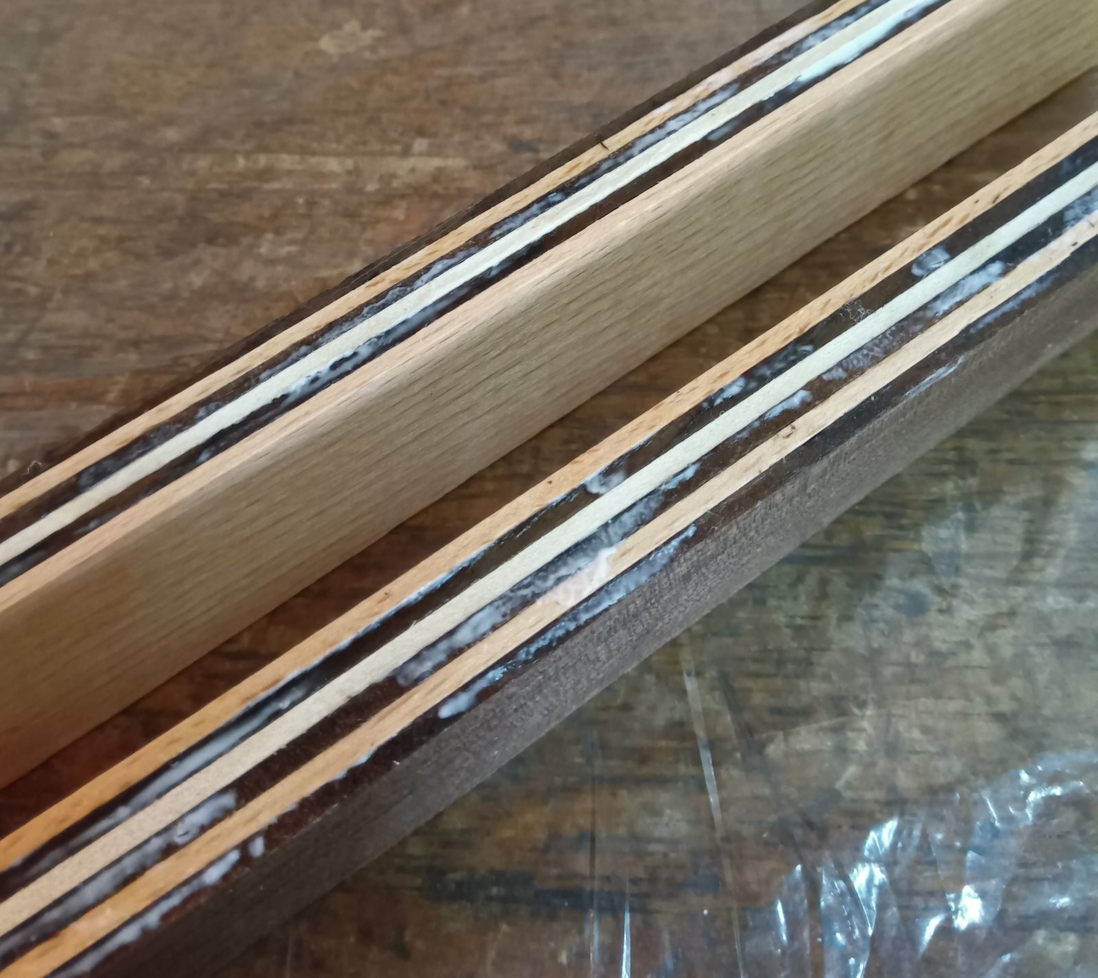 In addition to the above, today I assembled and glued some solid wood pieces, creating solid yosegi. As shown in the photo, it forms a striped pattern. Each layer is about 2mm thick, and with six layers, it becomes 12mm thick. Tomorrow, I will cut this block into 2mm pieces again and glue six of them together. This will form a solid marquetry with a checkered design (Ichimatsu). I am making this in order to create products using solid yosegi, though not for puzzle boxes. I haven’t decided exactly what to use them for yet, but they will likely become keychains or accessories.and The second photo shows the leftover solid yosegi from something I made before.