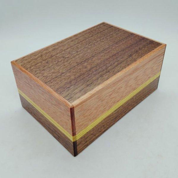 This is a 5-sun-size Japanese puzzle box. “Sun” is a traditional Japanese measurement; 1 sun is about 1.18 inches (3.0 cm). This puzzle box opens in 10 steps — the lid panel opens at step 7, and the drawer comes out at step 10. The top and bottom panels are made of sliced walnut wood, and the side panels are made of natural wood (Nyatoh wood, Urushi wood, and Walnut wood). This puzzle box is handcrafted by Hiroyuki Oka.