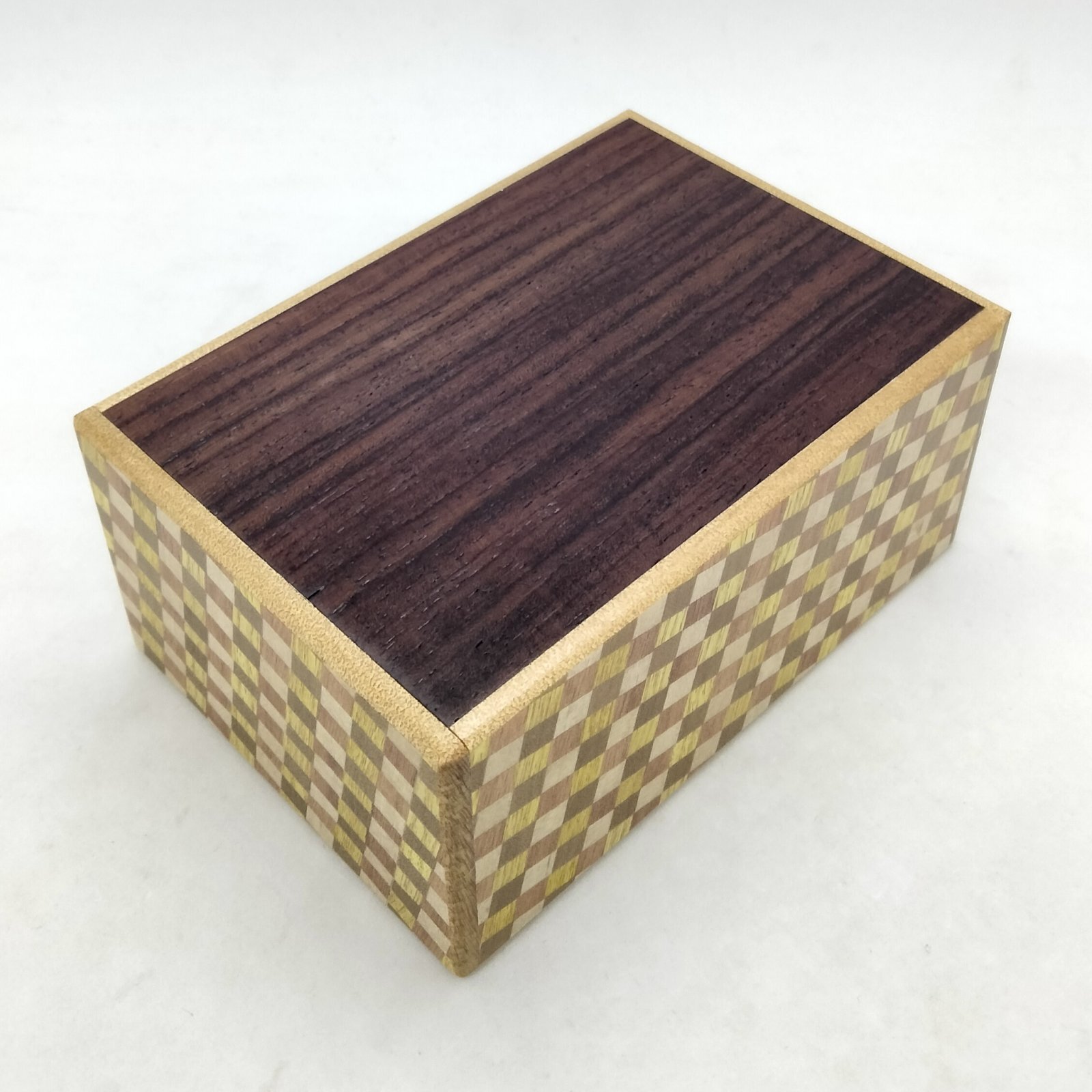 4 sun size Japanese puzzle box. 4 sun is a Japanese measurements. 1 sun is about 1.18 inch / 3.0 cm. This puzzle box is opened by 27 steps. The design is Rosewood and Ichimatsu yosegi. The Japanese puzzle box is made from only wood. This design puzzle box is made only by Hiroyuki Oka.