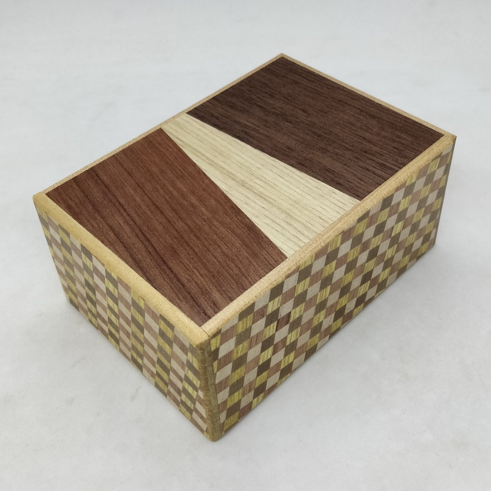 4 sun size Japanese puzzle box. 4 sun is a Japanese measurements. 1 sun is about 1.18 inch / 3.0 cm. This puzzle box is opened by 27 steps. The Japanese puzzle box is made from only wood. This design puzzle box is made only by Hiroyuki Oka.