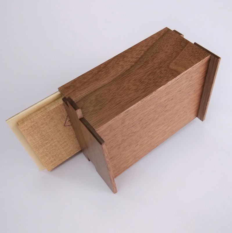 4 sun size Japanese puzzle box. 4 sun is a Japanese measurements. 1 sun is about 1.18 inch / 3.0 cm. This puzzle box is opened by 14 steps. The side of box is Walnut wood from North America.